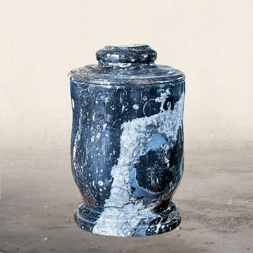 Urn kalksteen met fossielen en ader