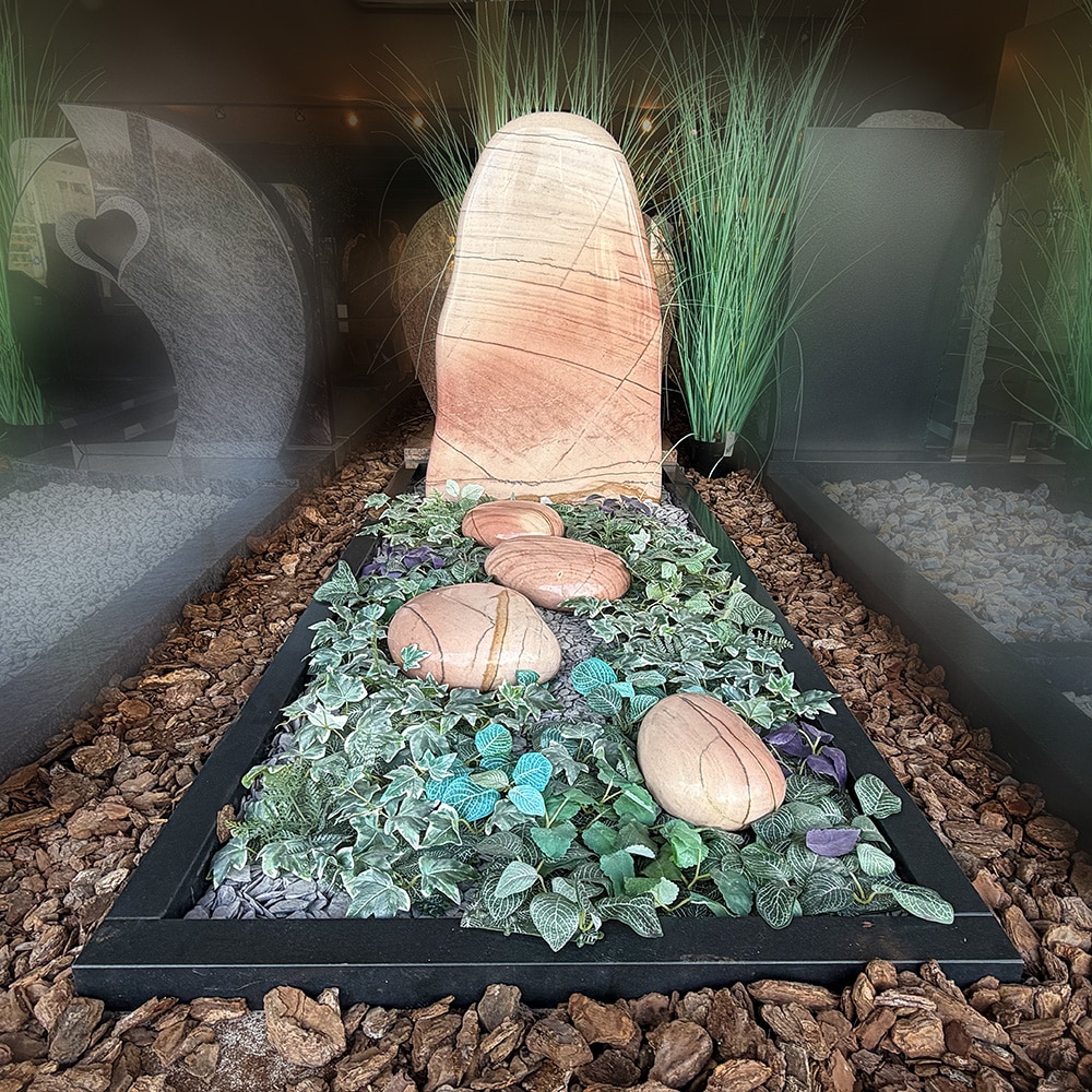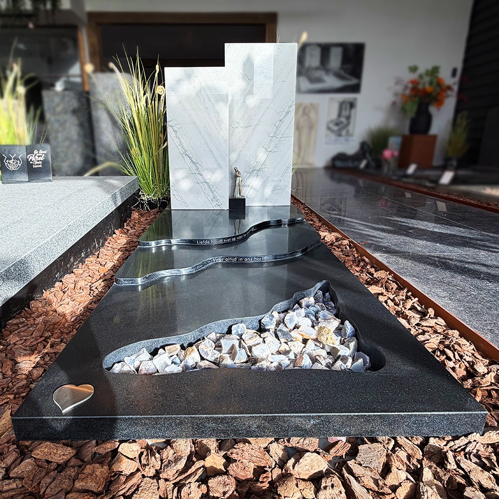 Grafsteen Wild Sea kwartsiet uit Brazilië. Een uniek materiaal wat door zijn kleur een alternatief voor kalkstenen en marmer kan zijn. Hier trekt geen vuil of alg in. Deze steensoort is te hard. De staande sten heeft een bruut gehakte buitenkant. De rest van het gedenkteken is gepolijst, glimmend gemaakt. Op de foto ziet u een beige kleurige kiezel tussen de banden. Vaak wordt gekozen voor beplanting wat dit gedenkteken een natuurlijke uitstraling geeft.
